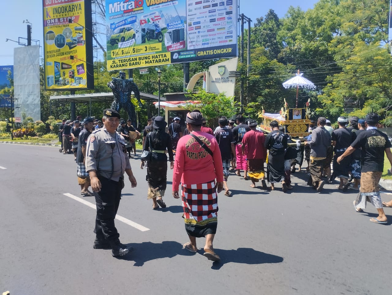 Mataram, NTB – Dalam rangka menjaga keamanan dan ketertiban masyarakat (Harkamtibmas), Unit Samapta Polsek Mataram melaksanakan patroli sekaligus pengamanan prosesi Ngaben umat Hindu yang berlangsung di Jalan Pejanggik, Kecamatan Mataram, Kamis (02/10/2025).