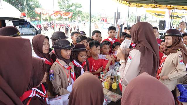 Stand Saka POM menampilkan berbagai alat uji sederhana, contoh bahan berbahaya yang dilarang digunakan dalam pangan, serta materi edukasi interaktif mengenai cara memilih obat dan makanan yang aman. Peserta juga diajak mencoba sendiri pengujian cepat terhadap sampel jajanan yang dibawa dari lingkungan sekitar perkemahan.