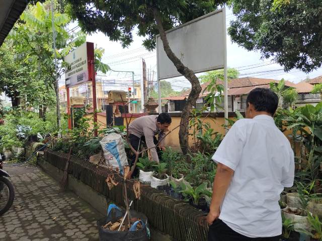Aiptu I Gede Gunartha bersama penyuluh pertanian melakukan pembersihan rumput liar pada tanaman apotek hidup jenis jahe dan kencur serta kunyit yang selanjutnya menyiapkan media untuk pembibitan sayuran.