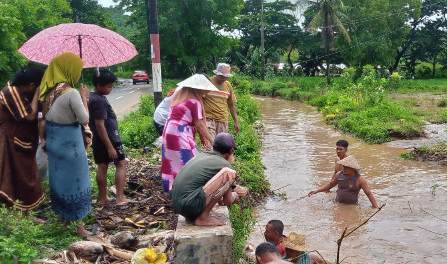 Personel Polri bersama masyarakat bahu-membahu memastikan sumbatan yang menghambat laju air dapat segera teratasi.