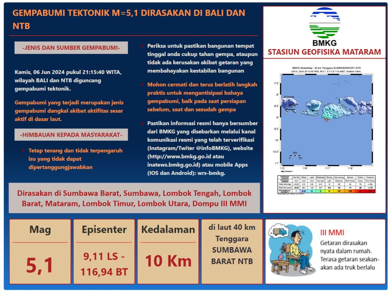 Mataram, NTB – Gempa bumi tektonik dengan magnitudo M5,1 mengguncang wilayah Sumbawa Barat, Nusa Tenggara Barat pada Kamis (6/6/2024) pukul 20.15.40 WIB.
